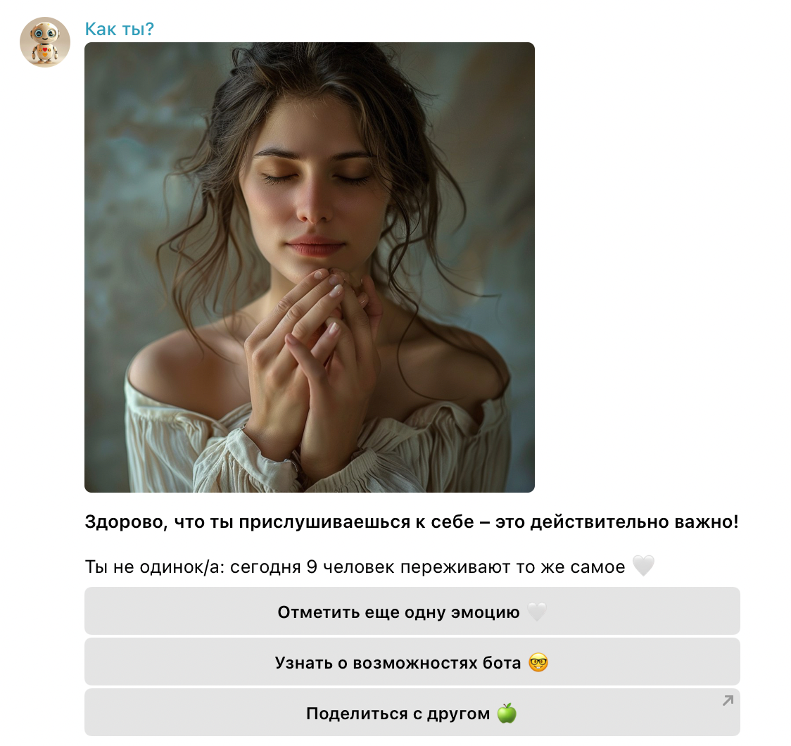 Это напоминание прислушаться к себе, заметить и назвать свои эмоции. В боте есть подсказки и рекомендации, чтобы навык слышать себя вырабатывался мягко, но уверенно.